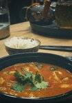 креветки, курица, кальмар, рис, шиитаке, черри, сливки, кокосовое молоко, шампиньоны, кинза