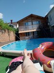 Гостевой дом для пенсионеров, причём очень тихих и спокойных. На территории дома должна быть полнейшая тишина! Я отдыхала с сыном 7 лет, бегать нельзя, прыгать нельзя, смеяться громко нельзя. Нужно сидеть тихо и разговаривать шёпотом. Мебель в номерах старая, посуда тоже. Бельё и полотенца за 8 дней не меняли ни разу! Ни убирали соответственно , номер снимали за 3200 с «кухней» и балконом. Микроволновка только на общей кухне. Есть бассейн, но борта не трогать, не прыгать, не плескаться)) работает с 8.00 до 20.00, дальше табу. Лежаков 4-5шт. Из ванной с туалетом очень неприятный запах канализации, практически постоянно. До моря идти далеко очень. Хозяева добродушные, но бзик на тишине все перекрывает( сюда мы точно больше не поедем.