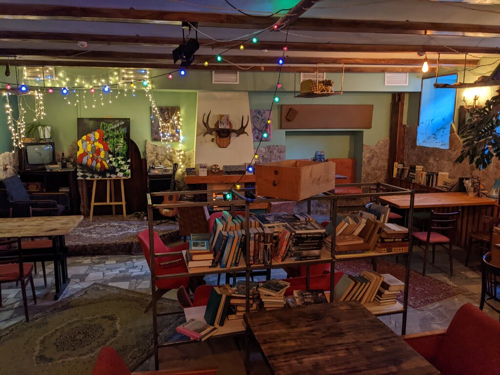 Приятные девушки за баром, уютно, спокойно, малолюдно, очень приятно, полно развлечений в виде настольных игр или собственно книг, только музыкальное сопровождение немного не соответствует духу обстановки
