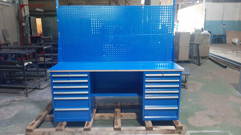 Недорогой и практичный рабочий стол лёгкой серии. Две опоры из стали толщиной 1.0 мм, полка-стенка или траверса, обеспечивающие жёсткость верстака, столешница из 24 мм плиты МДФ покрытая оцинкованным кожухом толщиной 1,2 мм