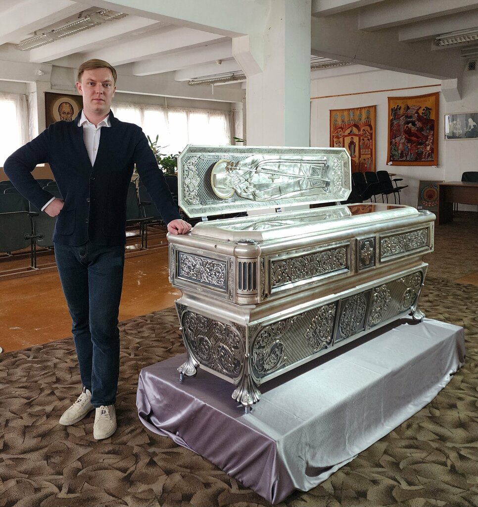 Евхаристический набор включает в себя потир, корчик, лжицу, поднос "Крест", поднос "Богородица", дискос и звездицу (на выбор классическая или древнерусская). Все предметы выполнены в соответствие с канонами церковного искусства.