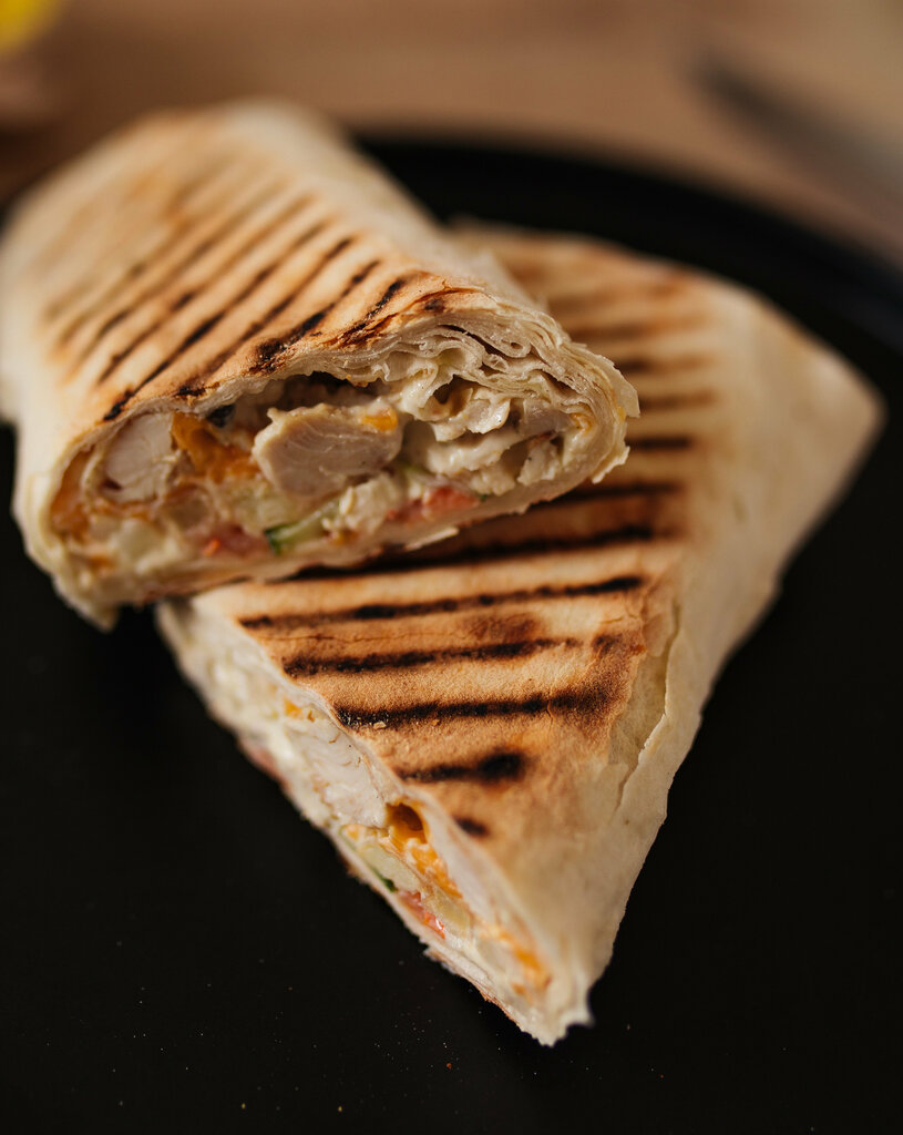Лаваш, сливочный сыр, котлета куриная, пармезан, бекон, огурец маринованный, салат листовой, белый соус, панировка