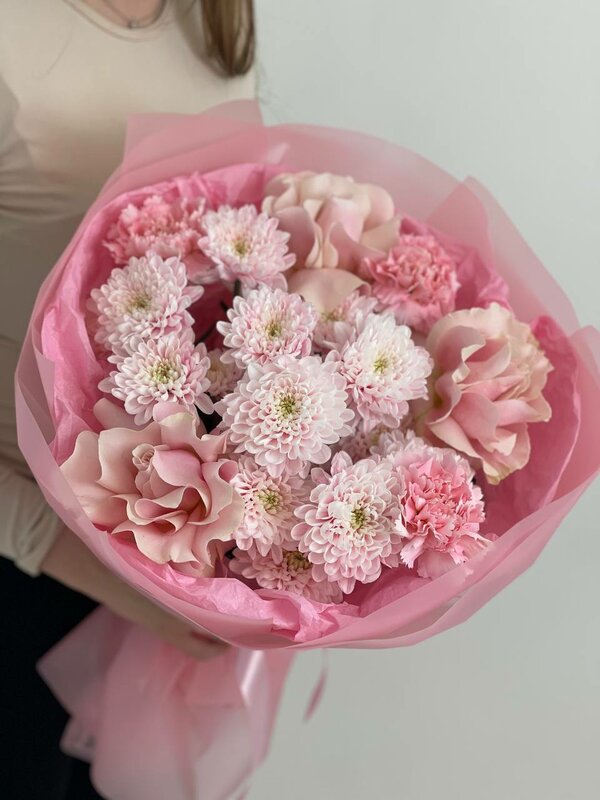 Нежный букет из гортензии, кустовых пионовидных роз, диантусов и эвкалипта. Легкий, романтичный, наполненный ароматом лета и свежести. Идеален для выражения теплых чувств и восхищения.