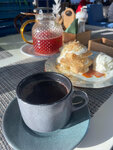 Добрый день!😁 Нас встретил приветливый персонал!Улыбчивая официантка очень быстро нас обслужила,при заказе обозначили все позиции!😉 Заказ: "Салат с тунцом и яйцом пашот" "Ростбиф с картофельным пюре", "Цыпленок карри с зелёным салатом, киноа в лимонной заправке","Вителло тоннато"Наполеон",латте, американо и чайник с малиновым чаем! Заказы принесли довольно быстро,предупредили, когда будем наливать чай,придерживать крышку(!) Салаты вкусные,но зелень немного "уставшая". Картофельное пюре принесли холодным,попросили заменить,принесли но все равно холодное🤪 с комочками,несоленое (одним словом-не вкусное) Вителло тоннато,🤣совсем не вкусно.Очень трудно жевалась(его не включили в счёт,за это вот большой плюс!) "Наполеон" в необычной подаче,вкусный Интерьер как в семейном кафе. Мягкие удобные диванчики,детские кресла,приятная музыка.Посуда слегка видавшая виды!😜 Чистый туалет со всеми сопутствующими принадлежностями! Особенно хочу отметить работу персонала!Вежливые и милые девушки!☺️ Наша оценка 4,7✌️