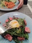 Я про кухню На мое мнение … Горячее вкусное ,но пюре из брокли очень жидкое не удобно брать вилкой Салат с тунцом вкусный Салат с курицей ,интересный Салат с ростбифом на любителя ,заправку из тунца я не поняла Телячьи щечки вкусные ,мясо мягкое ,такое как и должно Коктель алкоголтный из молока с фруктами ,интересный ,но от одного бокала стала болеть голова ,что заставляет задуматься о качестве алкоголя Обслуживание -молодые ребята студенты ,улыбчивае