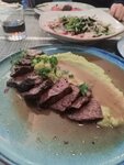 Ходили с девушкой. Однозначные плюсы: Из блюд очень понравилась говядина, она здесь очень нежная, с интересными красками, которые придают соуса. Мы брали тар-тар, витеолло тонато, стейк салат, тальята. Говядина обыграна интересно и вкусно. Понравилась пицца, интересный вкус в классическом воспроизведении. По алкоголю: Интересные коктейли, которые стоит попробовать, понравилось новое меню и интересные переделки классических коктейлей Водка подавалась не очень холодной, персонал отзывчивый, после просьбы дополнительно охладить, сделали Хорошо. Интерьер: Однозначно плюс, все очень мило и внимательно к мелочам, единственное наверное не хватало немного приватности. Из минусов: не приятно, что не встретили, но спишем на неожиданную загрузку и отсутствие персонала в понедельник. Даже на большой чек при просьбе стакана воды, продалась бутылка. Не понравилось ризотто с креветками, на вкус это рисовая каша с кабачками. Заведение однозначно стоит посетить, мы обязательно вернемся, желаем заведению развития и процветания