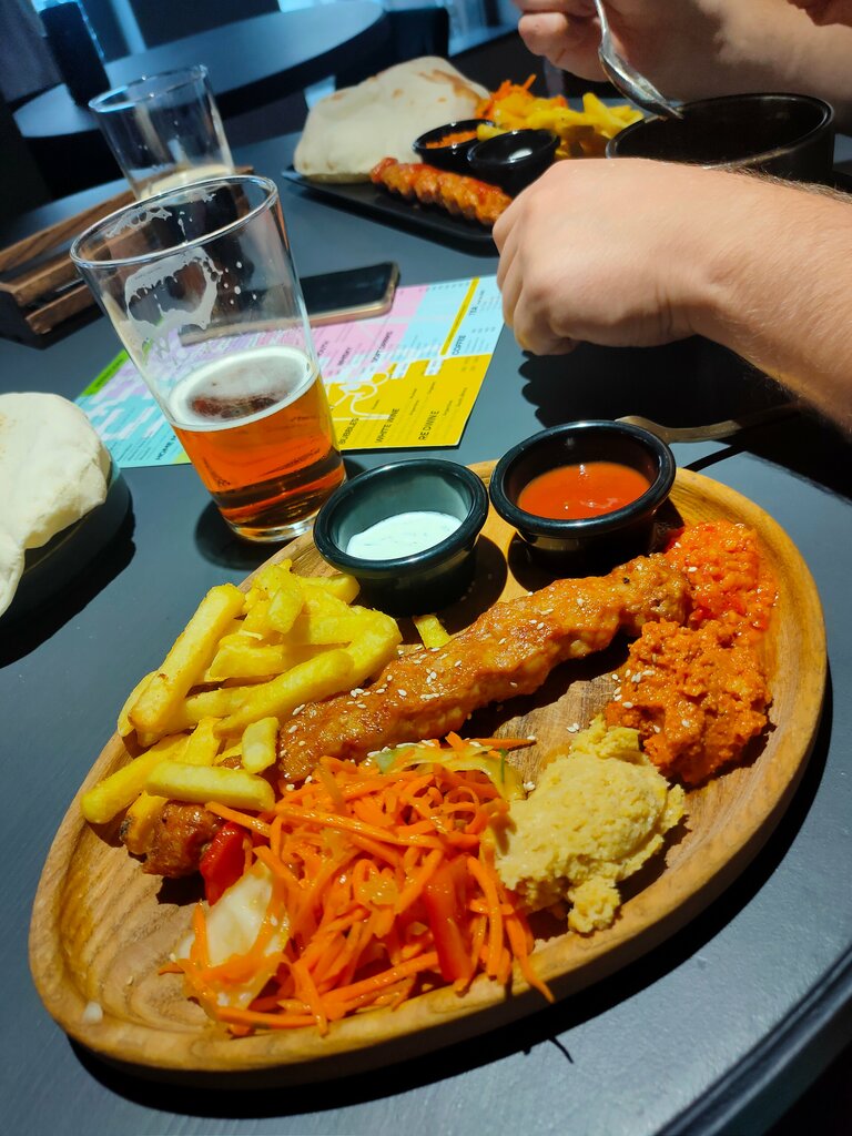 Неожиданно очень вкусное место. Брали роти, люля, бабагануш и питы. Огонь, за всё 900р. Супер вкусно Брали с собой. Не смогли с ребёнком посидеть внутри- один столик знатно выпивал, за большим столом очень шумная компания молодёжи что-то мастерила и материлась как сапожники) а так интерьер прикольно, да наверное, детям там не место, но даже м без них, я бы не осталась в такой компании. Пока ждали заказ, ушли в уголок, поиграли в настольный футбол