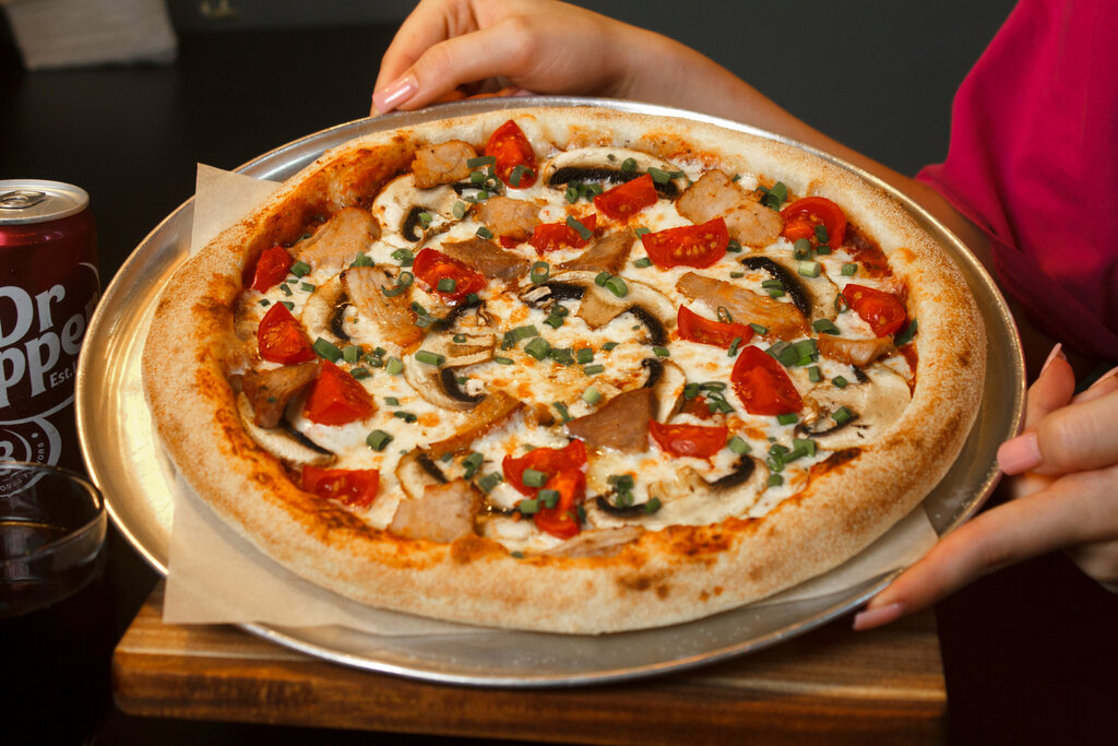 Томатный соус, натуральный сыр моцарелла, бекон, пепперони, ветчина и шампиньоны