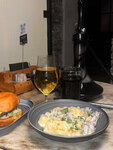 С итальянскими травами и чесноком, томатами черри, кедровым орехом. Подается с чиабаттой.