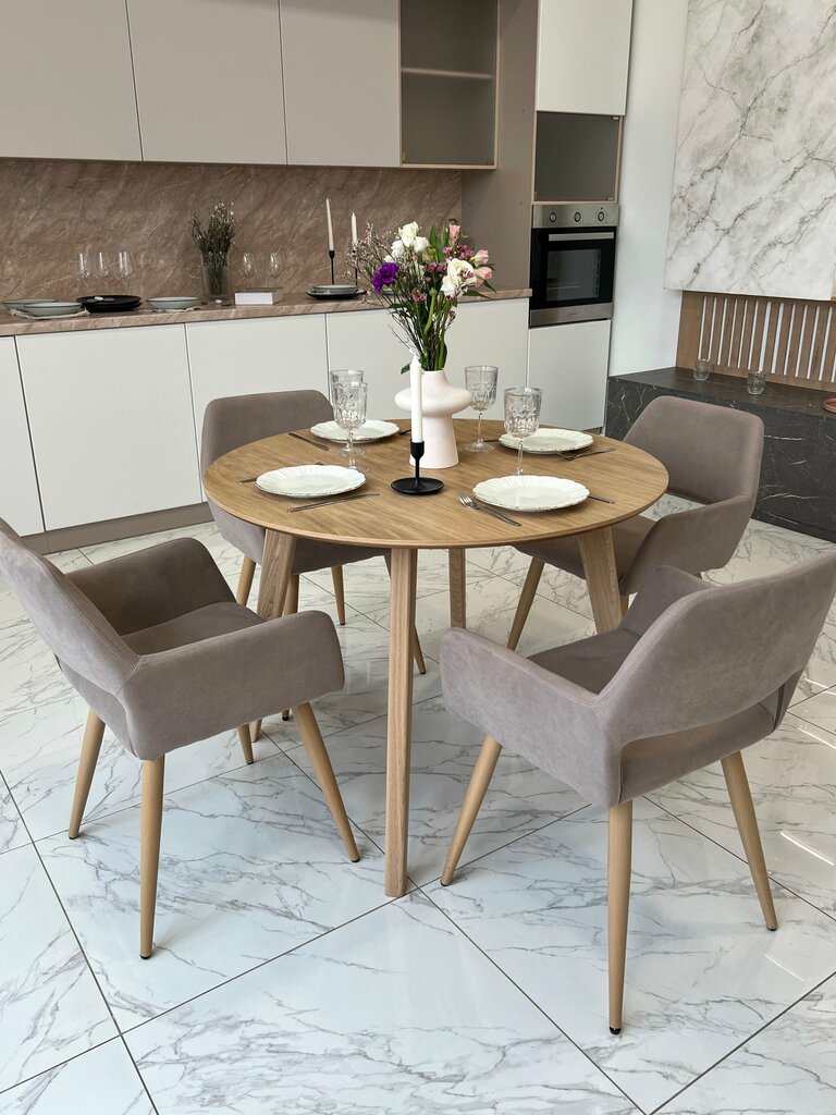 Заказали стол модель Сканди диаметром 110 см, цвет натуральный. В мессенджере консультанты из магазина помогли выбрать. Стол понравился, красивый. Сидеть удобно. Собирать с шуруповертом в принципе оказалось несложно, где-то за час неспеша можно собрать. Мы довольны.