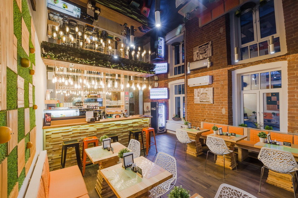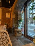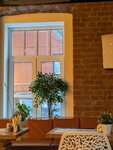 Отзыв о кафе. Интерьер уютный, хотя и старомодный: кирпичи и глянцевый потолок с отражениями - такие оооочень надоевшие девяностые. Музыки нет - есть телевизор, вот это прямо плохо. Поесть особо нечего, из десертов - чизкейк и мороженое, кофе кислый и жидкий, совсем не по вкусу. В общем, глазу приятно, но вернуться не хочется.
