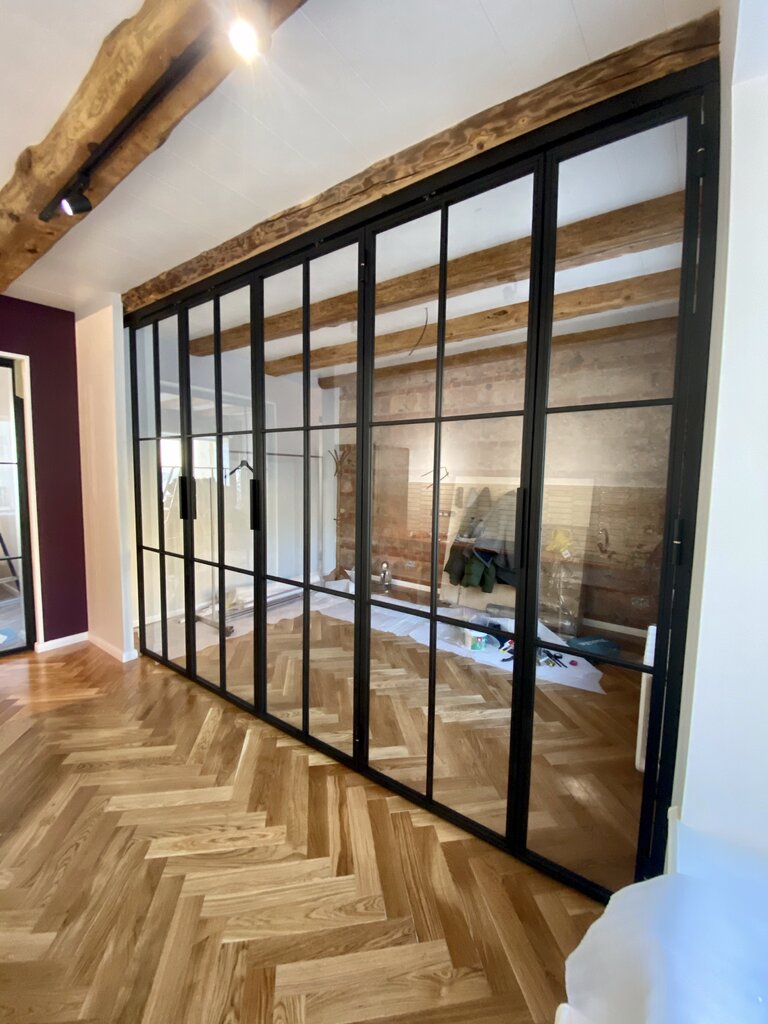 Лофт перегородка из металла и стекла с распашными дверьми