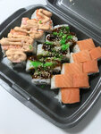 Холодные роллы: том (рис, лосось, сливочный сыр, тобико, кунжут, унаги соус) и гудвин (рис, сочная курочка, нежный сливочный сыр, стружка тунца, пикантный спайси соус, кранч-лук) Запеченные роллы: бонсай (4 шт.) (рис, снежный краб, хрустящий огур