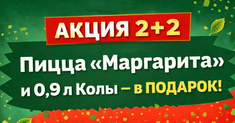 Новая акция «2 + 2»! Дорогие друзья! При покупке любых двух пицц 42 см. мы подарим вам: – пиццу «Маргарита» (32 см); – колу (0,9 л). Пора...