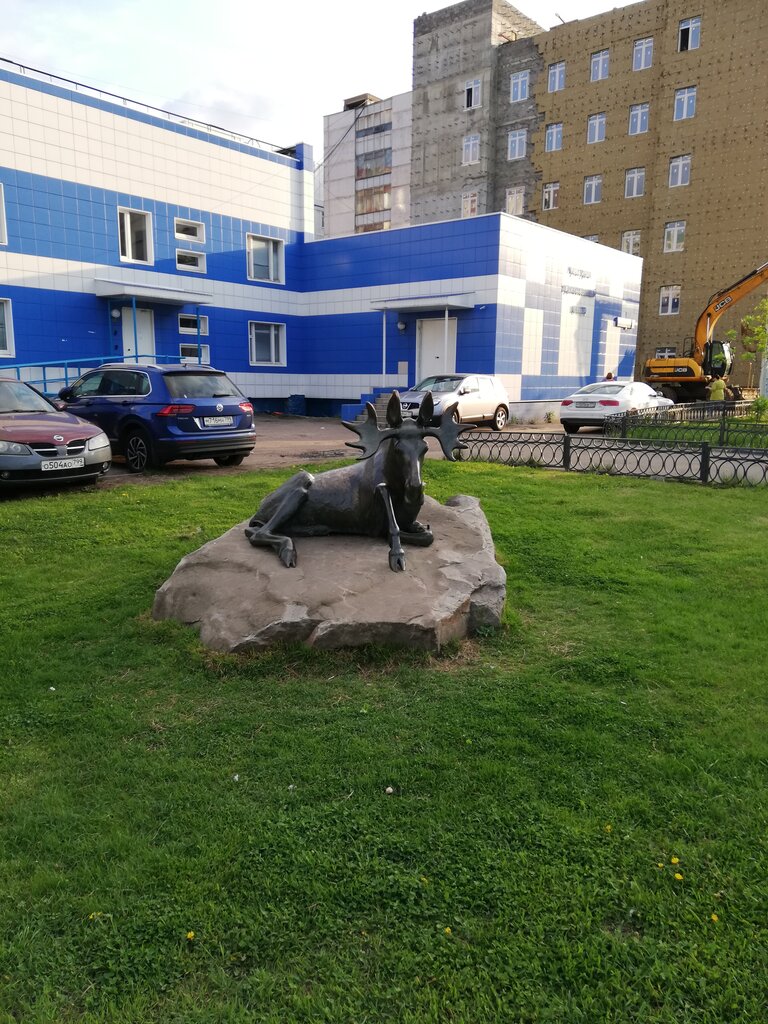 Здравствуйте, одни вопросы зачем и почему? Скульптура размещена близко к проезжей части. Почему животное запечатлено лёжа? Лось ранен или болеет или устал?)