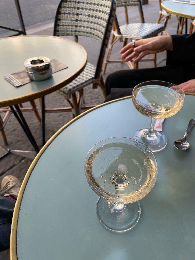 delicious coffee and champagne in beautiful cream bowls. it is very pleasant to stay here and sit with a glass, in the very center of Paris, close to the streets with shops