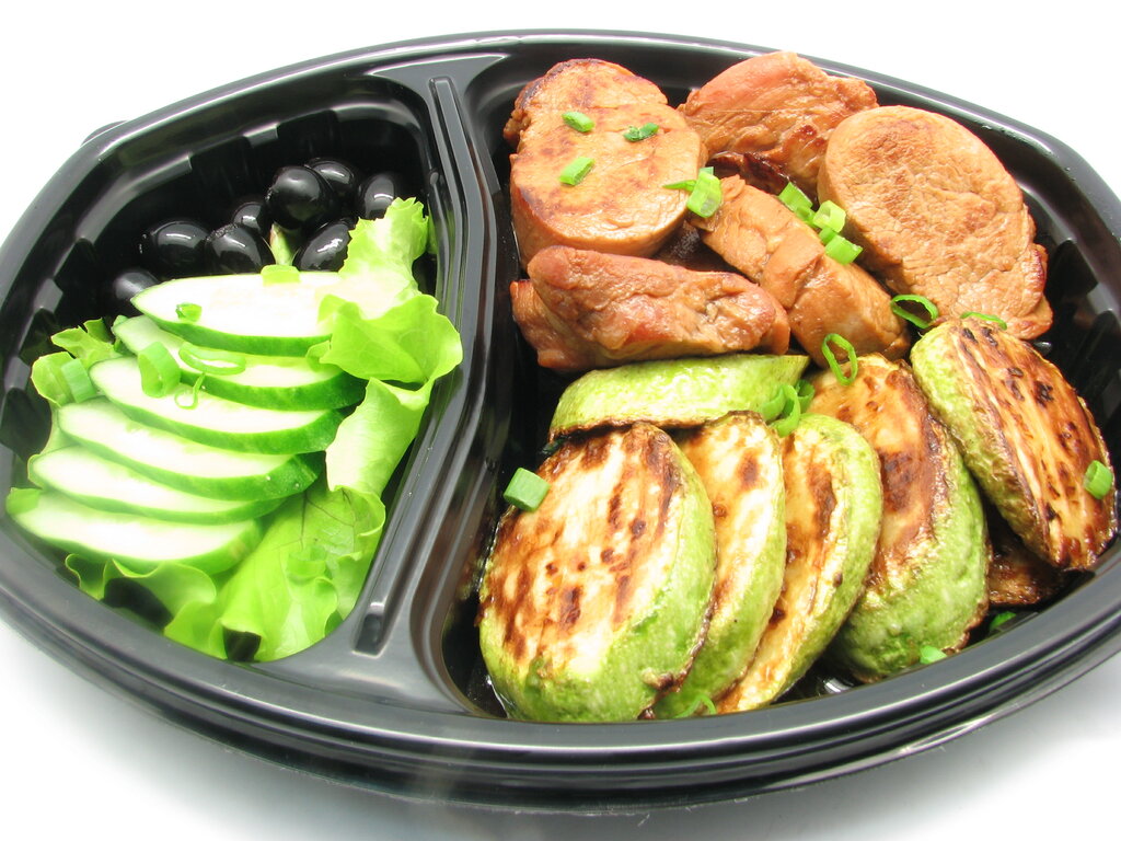 Плотный 6-6-9 салат из огурцов с майонезом, суп куриный с вермишелью, филе минтая со стручковой фасолью на пару. 100/300/100/150 гр. хлеб, приборы