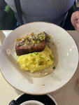 Классический куриный шницель покрытый хрустящей золотистой корочкой, подается с нежным зеленым салатом из шпината и листа салата, приправленный соусом "Цезарь" собственного приготовления. Оформлен сыром "Пармезан". Подается на подушке из голландск...