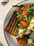 Нежное мясо цыпленка маринован ное в соусах Кимчибейс и соевом , с обжаренным картофелем-беби с укропом с добавлением чеснока на сливочном масле, и овощами (шпинат свежий, помидоры, лук фиолетовый, брокколи), с соусом на основе йогурта и сыра с зе...