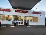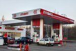 Хорошая заправка перед выездом из города. Есть все виды бензина, в т.ч. АИ-100. Есть магазин с мелочами, ГСМ и едой. Оплата по карте.