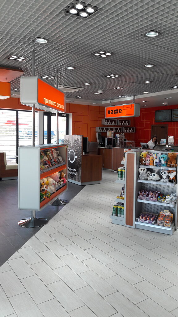 АЗС известной и популярной российской нефтяной компании. Удобный заезд. Хорошая разметка для движения по территории. Новое и исправное оборудование. Заправка до полного бака. Очень хороший бензин. Технологичное оснащение в павильоне: в туалетной зоне и в зале. Чисто, без посторонних запахов Хороший выбор товаров и продуктов в дорогу. Кофе-аппарат с хорошим вкусом и сиропом. Попали во время монтажа новой мебели в зоне со столиками. Летняя открытая зона с тремя столиками. Приятно писать отзыв на такой объект! Рекомендую для заправки и отдыха.