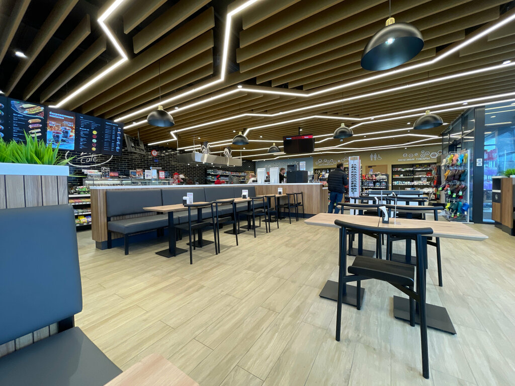 Отлично для остановки с детьми. От трассы заправку закрывают деревья. Есть детская площадка, кухня с сырниками, хороший кофе, большой магазин.