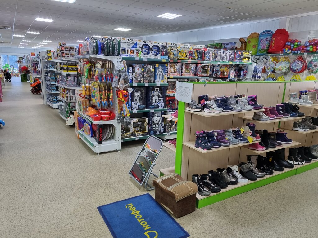 Широкий ассортимент товаров (мужская, женская и детская одежда, детская обувь и игрушки), цены средние и ниже среднего. Товары российского, турецкого, киргизского и китайского производства. Мы приехали, чтобы подобрать обувь маленькому ребёнку, но к сожалению не нашли ничего без супинаторов и с гнущейся подошвой, хотя тут продаются популярные фирмы: Котофей, Тотто, Сказка, но модели попались неудачные, хотя цены приятно удивили. Зато купили красивую кепку всего за 250 рублей👍