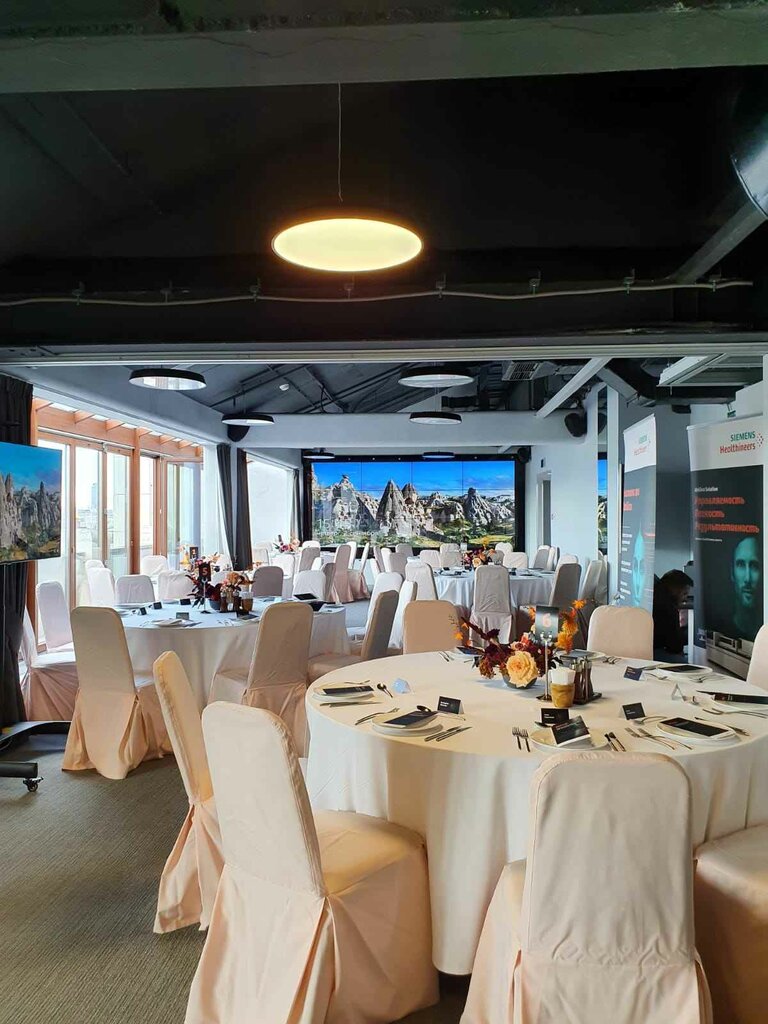 Зал создан в популярной лофтовой стилистике. Графитовые оттенки использованы в декоре пола и стен, а глубокий черный цвет потолка становится отличным фоном для авторской системы освещения. Окна в пол визуально расширяют пространство, делая его бо...