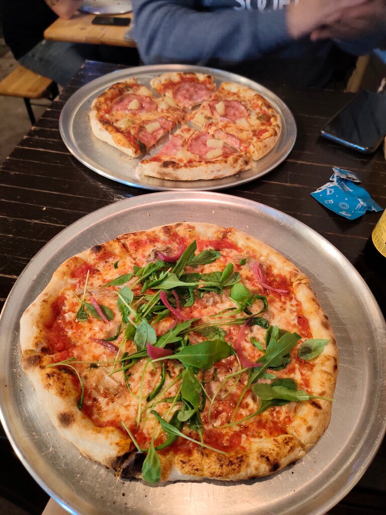 Чудное местечко ,пицца по истине хороша и причем совершено любая с мясом или без. Мой топчик охотничья,5 сыров и конечно под бело винцо груша горгонзола🙌👍. А ещё видела приложение есть у ребят,спасибо за доп комфорт 👍и наклейки забавные 😂обязательно возьмите с собой питу 🙌😎💫я люблю цезарь