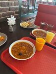 Столовая так себе - выбор первых блюд небольшой (солянка и харчо ) , порции по сравнению с другими заведениями небольшие . Большой выбор компотов , морсов и соков по бюджетной цене . Все было свежим , по вкусу вкусно . Цены среднестатистические . Внутри уютно и чисто . Есть детские стулья .