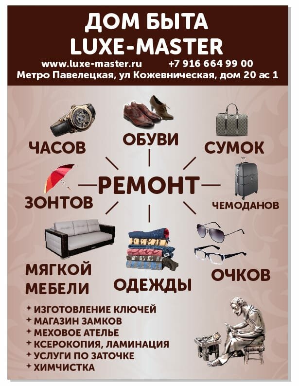 Хорошие мастера по ремонту обуви и сумок, ремонт делают качественно, всегда всё согласуют, если есть какие-то сложности, заказ обычно готов раньше назначенного времени. Также понравился мастер в ателье. Ценник обычный, московский