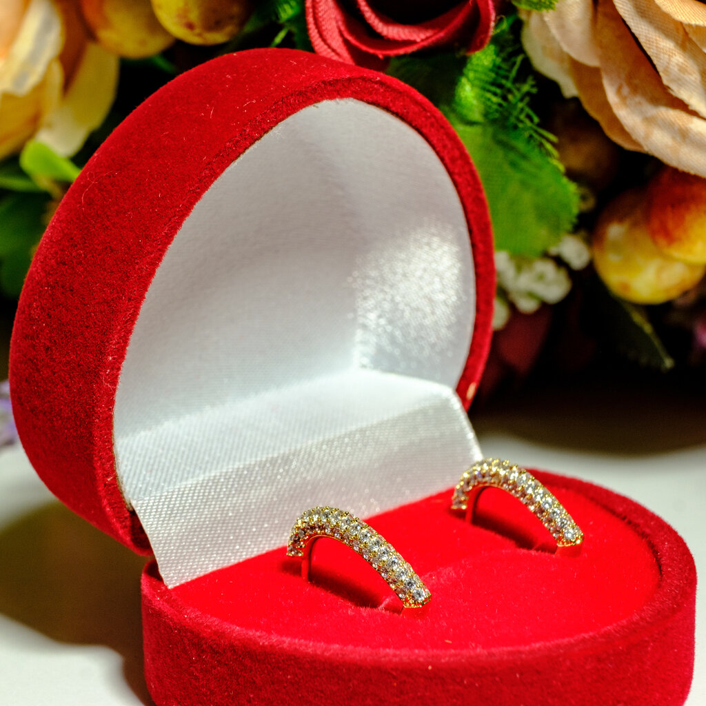 Серьги-пусеты выполнены из гипоаллергенного сплава с покрытием золотом 585 пробы и вставкой цирконов, штифт из серебра 925 пробы. Изделие не требует особого ухода, не боится воды и не вызывает аллергических реакций. Подходит для ежедневной носки.