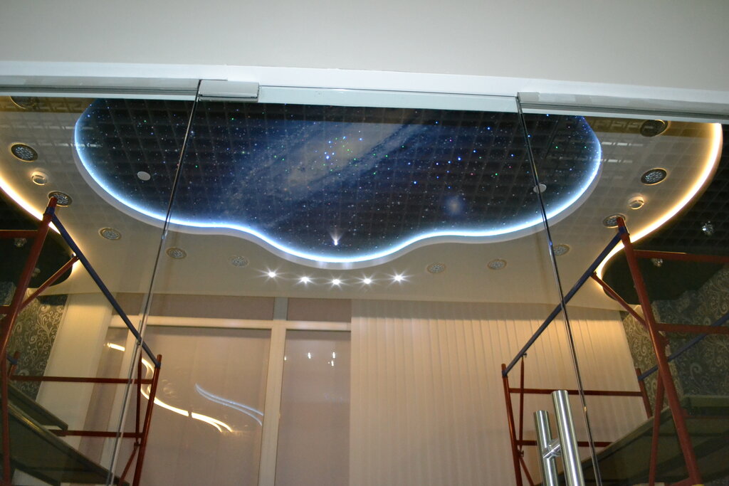 Натяжные потолки с любым цветом и материалом, с любым замороченным дизайном готовы исполнить. Мы сделали все проще и заказали простые белые, но в два уровня. Получилось очень круто.