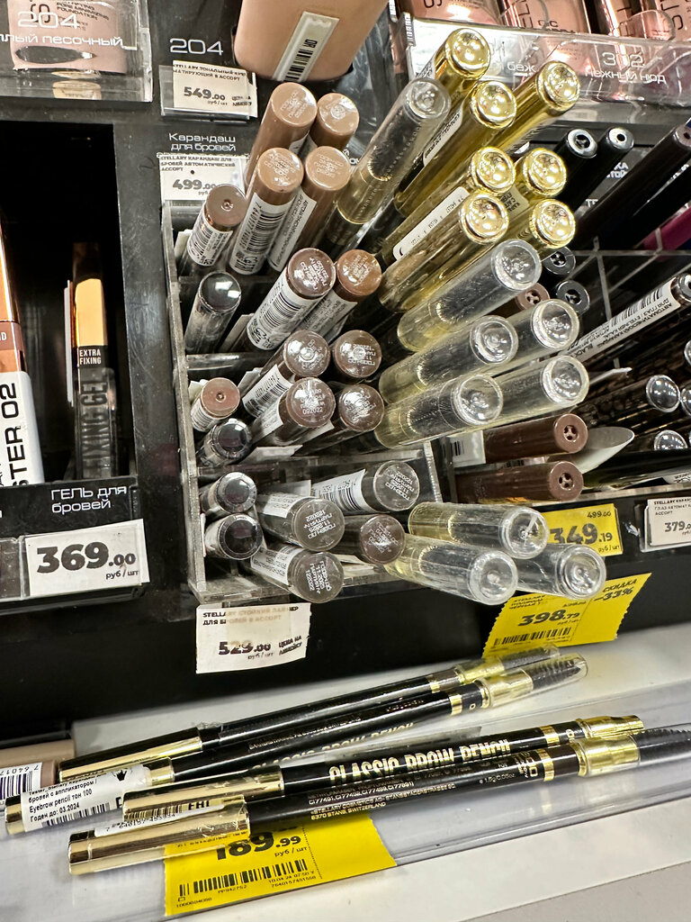 «Ценники для того, чтобы их читать»сказала мне продавец магазина, давайте вместе посмотрим, насколько легко найти этот ценник, понять, что он относится именно к лайнерам для бровей, которые натыканы слева, и что ценник надо искать под товаром. Вот тот ценничек со следами скотча я должна была прочитать. Квест.