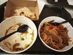 Еда - это полный кошмар. Заказали "корейскую окрошку", по картинке из меню выглядит вкусно и красиво, чем-то напоминая кукси, а по факту это насыпанная горстка сухой курицы(из соседнего гирос кафе), крахмалистая дешевая лапша, огурец, помидор, яйцо и морковка по корейски, и видимо они решили, что какой-то рассол, как будто из-под огурцов или той же морковки, будет отличной основой для блюда. Есть это подобие блюда практически невозможно, крайне разочарованы данным заведением