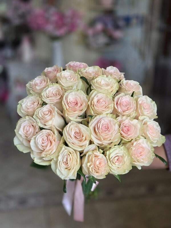 Состав : Роза кремовая (19 шт.) Упаковка Обращаем Ваше внимание: оформление и оттенки цветов могут отличаться от фото с сайта. Если Вам нужны определённые цвета, укажите их в комментарии к заказу, по возможности мы подберем их для Вашего букета.