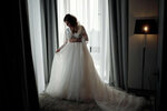 Свадебное платье с рукавом из шикарной ткани со светоотражающим шиммерным блеском корсета и непышной юбки выполнено из нескольких слоёв фатина с лёгким мерцанием.