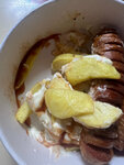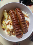 Сосиски, картофельные дольки, моцарелла, огурцы малосолёные, белый соус, красный соус