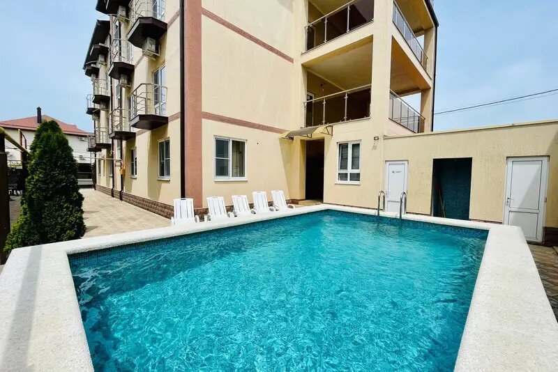 Прекрасное место👍👍👍, доброжелательные хозяева👋, видно, что люди все делают для комфортного отдыха, номера большие, стильные, все кругом чистенько, постельное беленькое, не затасканное, отдельно хочу выделить матрасы на кроватях- это бомба!Кондиционер и телевизор.Для детей есть хорошая площадка( батут, качели), много шезлонгов и большой бассейн 💪👍,есть столики с зонтиками, хорошая зона для отдыха.Кухня, если нужно приготовить, но мы ходили в столовую через дорогу( готовят не плохо и цена не кусается). Так же на первом этаже есть магазин, очень удобно, молодцы) До моря 10-15минут прогулочным шагом,через рынок и кафе различных,было не скучно идти.В целом всем остались очень довольны, однозначно рекомендую это место!Обязательно вернёмся, 🙏❤️❤️❤️🫶