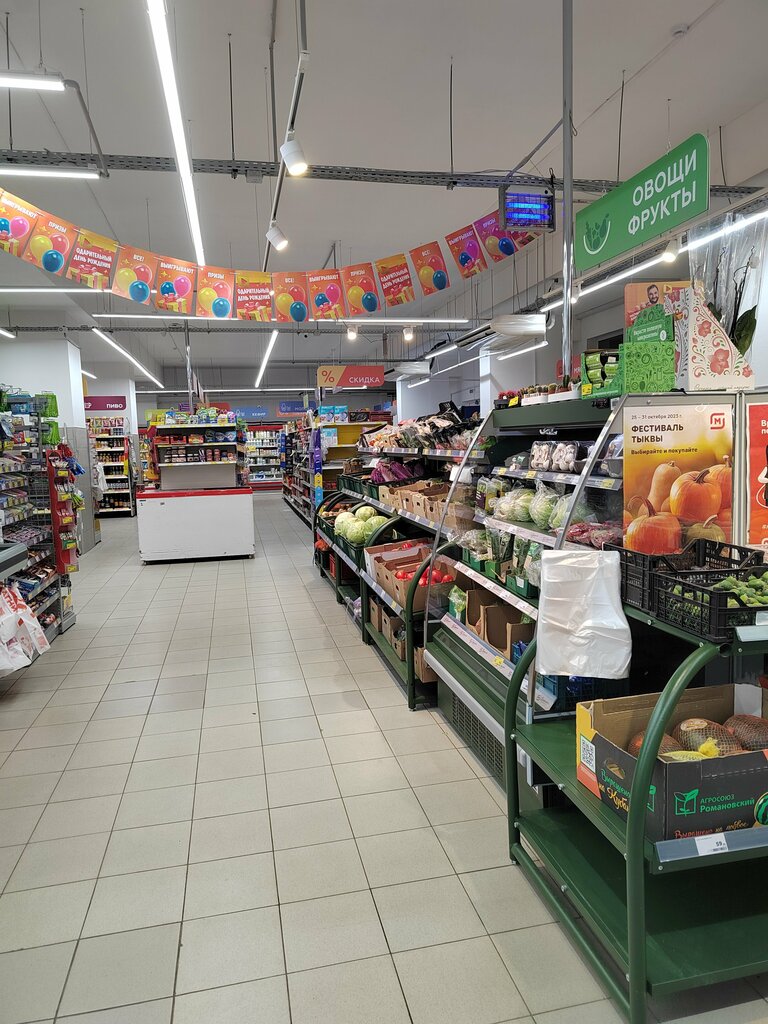 Магазин расположен в удобном месте. Вежливый персонал. Иногда бывают разногласия в ценах, но кассиры быстро возвращают разницу без пререканий. В утренние часы есть скидка для пенсионеров. Ассортимент товаров большой.