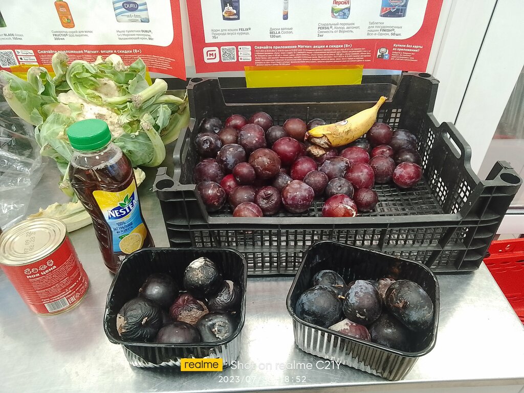 Вечно заставленный зал поступившим и не разобранным товаром, просроченная продукция, гнилые овощи и фрукты. Пора сменить зав.магазина.