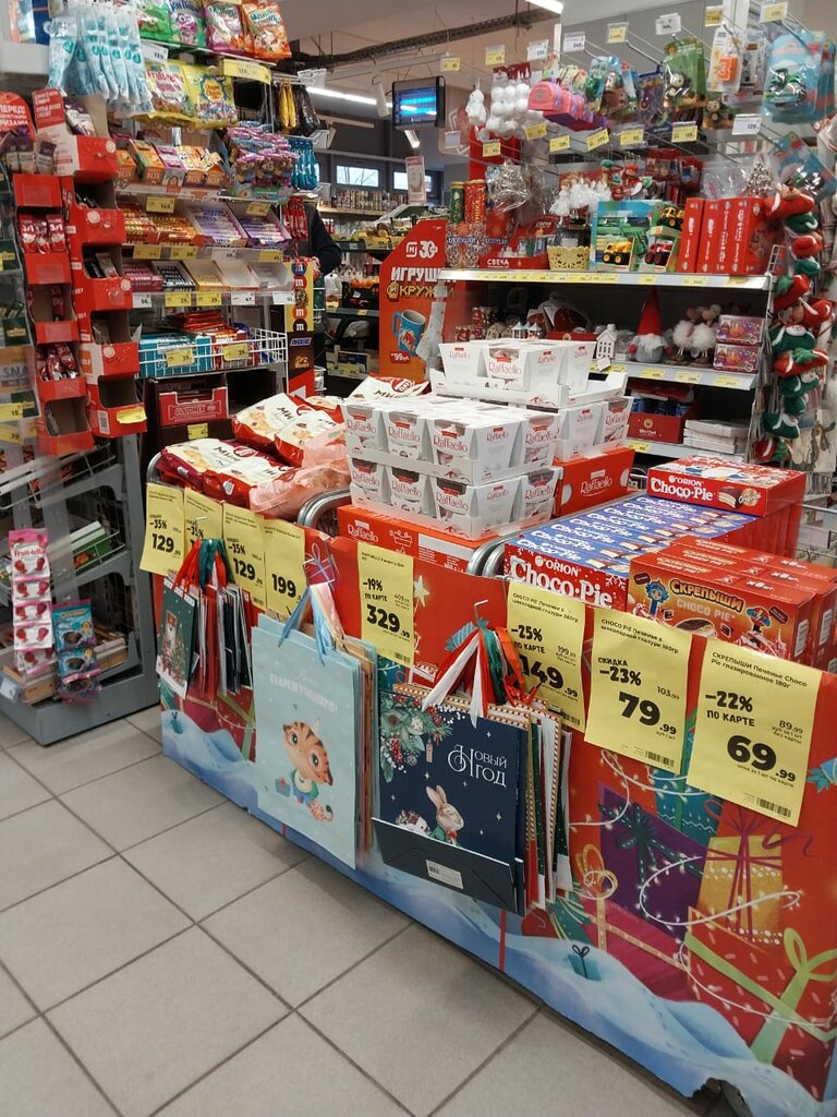 Маленький , чистый, уютный магазинчик. Ценники на месте , персонал вежливый - готов придти на помощь 😆 с выбором товара! Классное новогоднее оформление перед касами