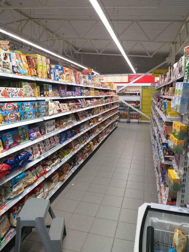 Большой магазин , представлено многообразие товаров Удобно расположены группы товаров, всегда чисто. Приветливый персонал, очереди на кассах нет.