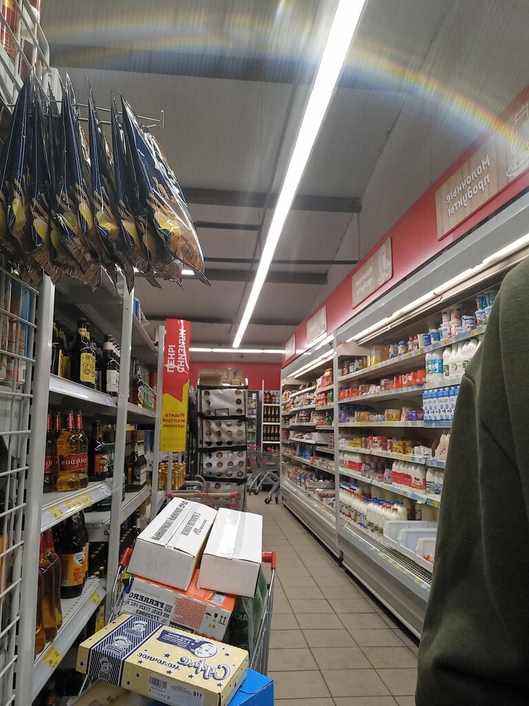 Хороший магазин, персонал старается. Работают также кассы самообслуживания (оплата на них только по карте), что очень удобно. Большой выбор товаров. Также недавно поставили кофейный автомат. Рядом перед магазином есть парковка.
