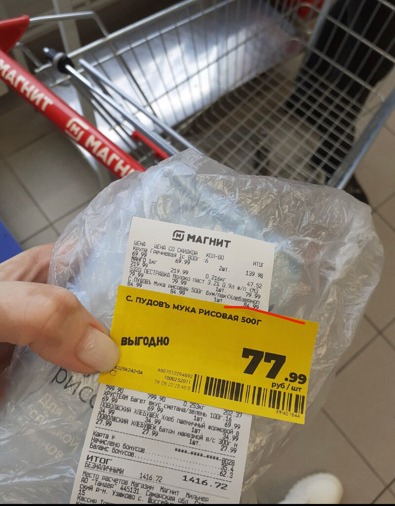 Обманули. Пришла домой, а у меня в чеке были ребрышки свиные копченые, которые я никогда не покупала. Вернуться не смогла, потому что дома маленький ребенок и туда сюда с ним ходить невозможно. Стараюсь не ходить в этот магазин больше.