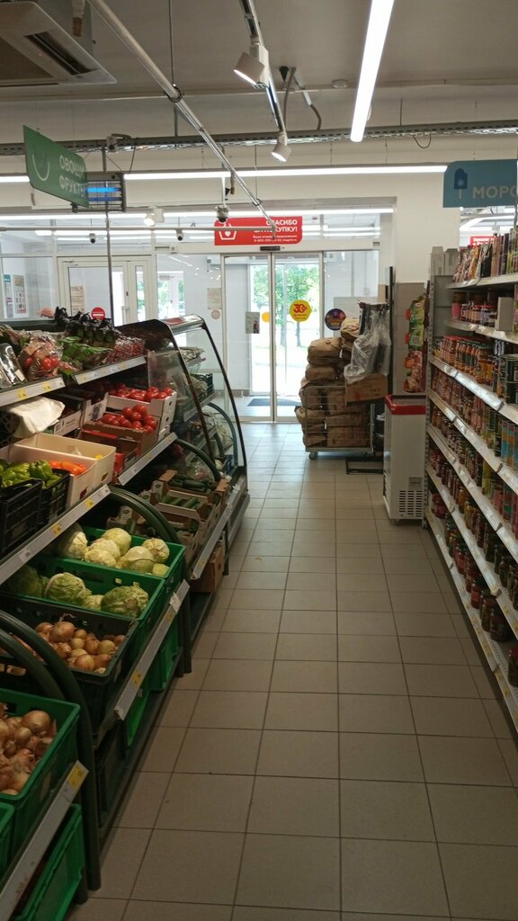 Неплохой магазин , хороший выбор овощей и фруктов . Невсегда в зале полная раскладка товаров , бывают полупустые полки и стоящие на палетах продукты и никто не спешит их раскладывать , персонала видно не хватает