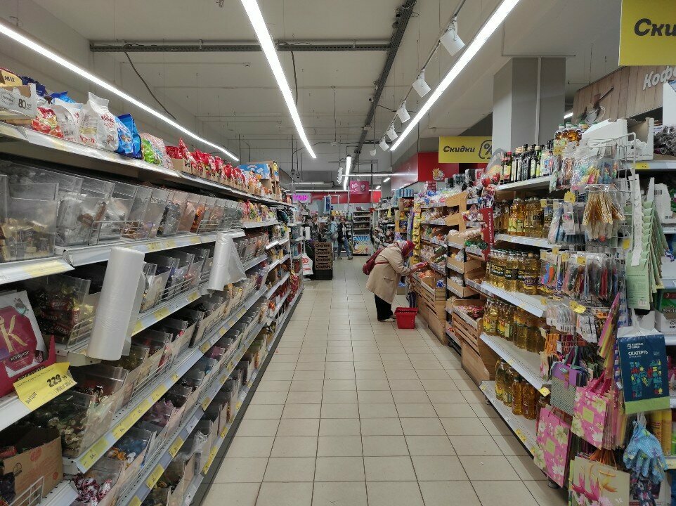 Отличный относительно новый 🧲 с большим количеством популярных товаров на каждый день и не только, а также имеет свежая выпечка, и кофе ☕️ машина в наличии, + соответственно терминал само обслуживание +