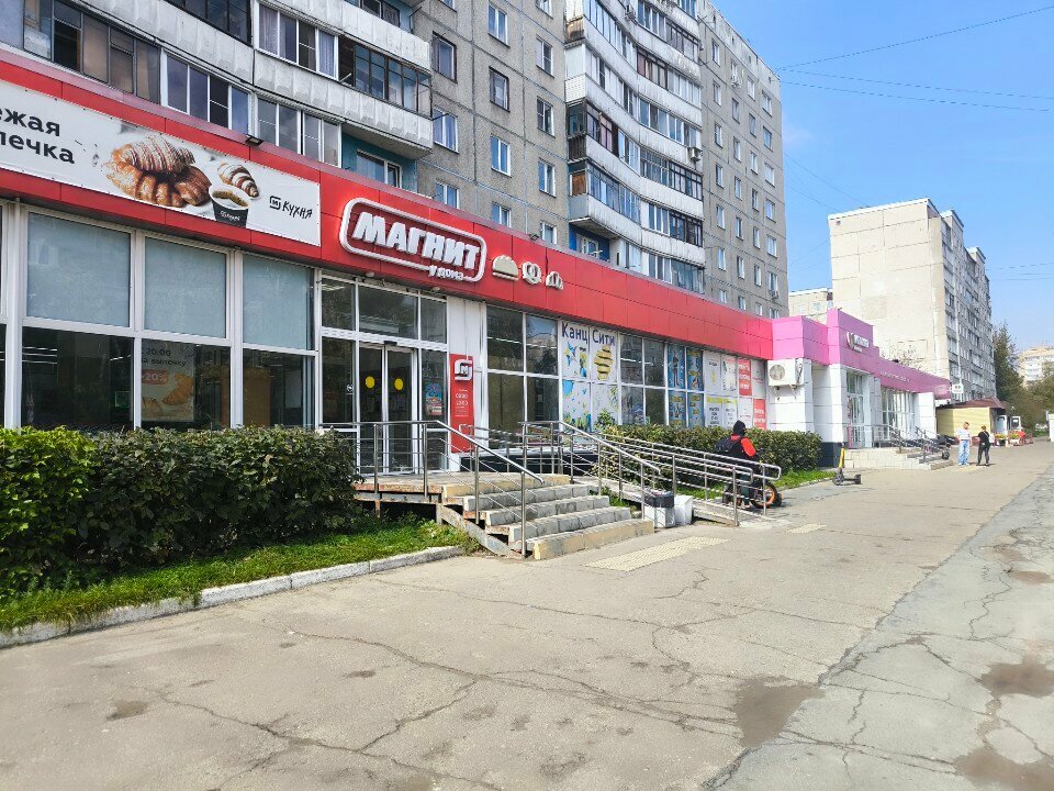 Магнит он и в другом городе Магнит.Живу прям над ним.Очень удобно:спустился,обошëл и Магнит.После тренировки тоже можно отлично провести время в нëм.Вкусная выпечка,неплохой выбор продукции.Только продавцы не ахти. Особенно была Оксана,у которой белый цвет волос.Очень много хамила,но еë убрали.Ещë выделю,что на обычной кассе большая очередь.Я часто оплачиваю продукты на кассе самообслуживания,но когда наличный расчёт,то долго приходится ждать свою очередь.Какая трудность у второго кассира открыть вторую кассу?А так,магазин как магазин.
