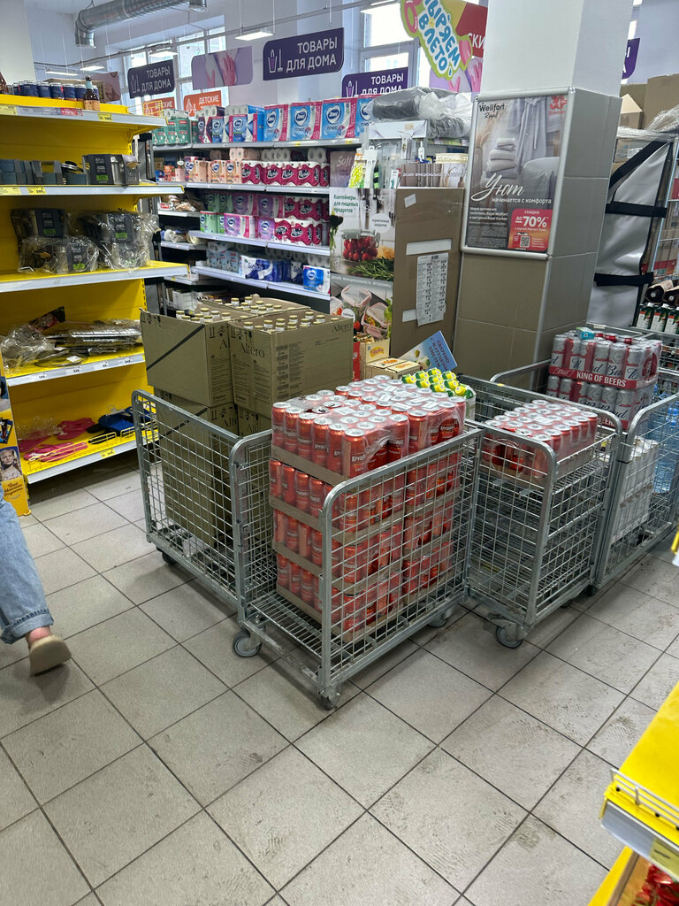 Отвратительный магазин! Ассортимент низкий (, постоянно между стеллажами неразобранный товар отвратительный персонал, Дополняю спустя время: тележки с товаром как были так и стоят полки пустые, к вечеру в холодильнике молока нет, овощи и фрукты не свежие, рыбы заморозки нет никакой ( холодильник пустой, с мясом очень скудный выбор, на такой большой жк неужели сложно навести порядок и поставлять нормальную продукцию и в полном объёме? Только в алкоголе у них все прекрасно кроме бардака с тележкой к химии и сокам не пройти(