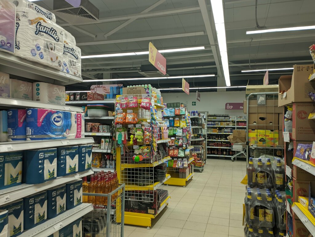 Это хорошее место. В магазине много товаров, я не заметил просроченных продуктов. Также хочу отметить, что в магазине чисто. Единственный минус — большие очереди.